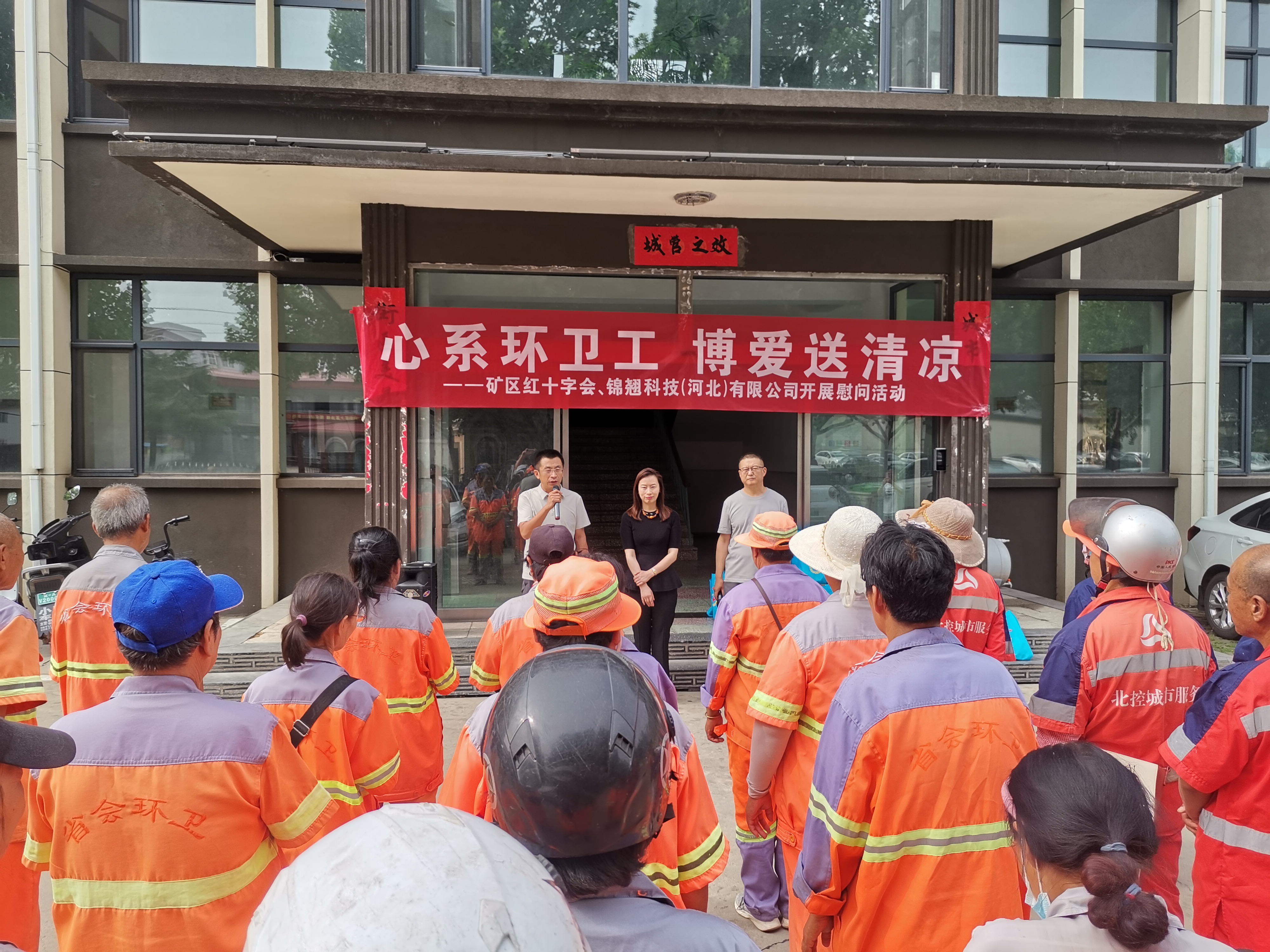 7月2日上午,矿区红十字会联合锦翘科技(河北)有限公司,在矿区城市管理行政综合执法局院内,对全区常年奋战在一线的环卫工人开展“心系环卫工,博爱送清凉”慰问活动,让他们在炎热的夏日来临之际,感受到区委、区政府以及爱心企业锦翘科技(河北)有限公司的关爱。