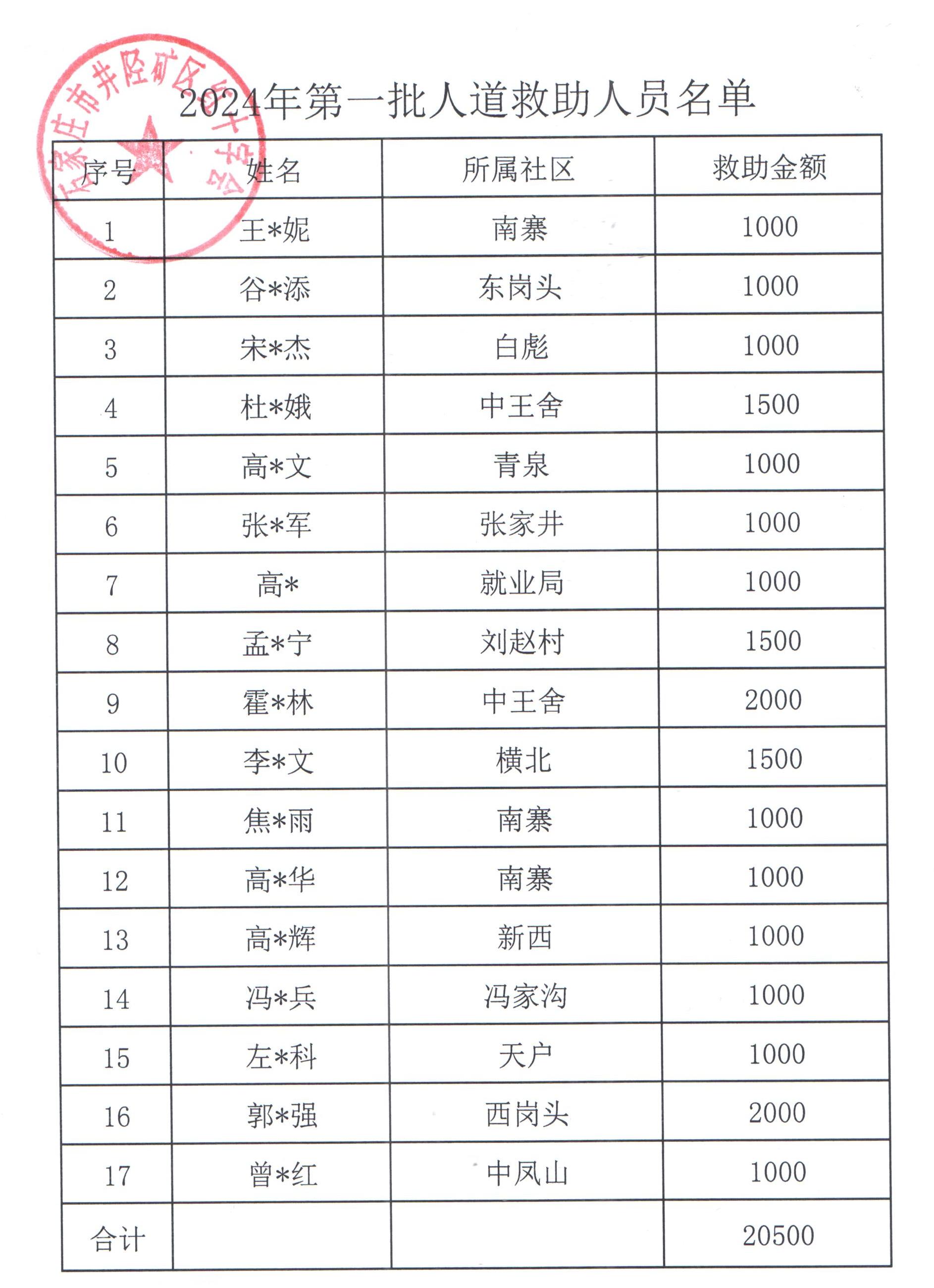 根据井陉矿区人民政府办公室印发的《井陉矿区红十字会大病贫困群众救助管理办法(试行)》,经本人(亲属)申请,由社区、乡镇逐级核实提交矿区红十字会审核,所在社区公示无异议后,矿区红十字会向申请人道救助的17名困难群众发放救助金。救助情况公示如下: