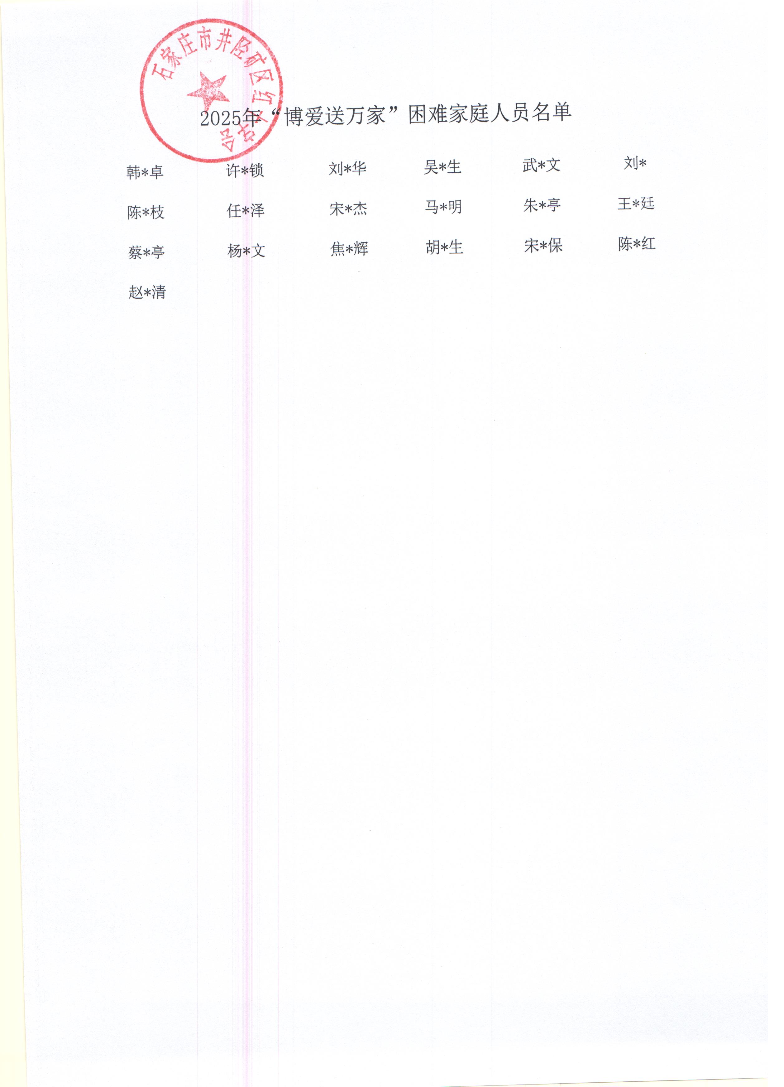 根据石家庄市红十字会转发《河北省红十字会办公室关于开展2025年红十字博爱送万家活动的通知》(石红字[2024]64号)文件要求,结合我区工作实际,制定慰问方案,通过基层社区摸底公示慰问人员名单,确保把党和政府的温暖送到困难群众手上。本次活动共发放物资19套(其中:上级下拨家庭箱19箱,价值5557.5元,加多宝19箱,价值1045元)总计价值6602.5元。名单如下: